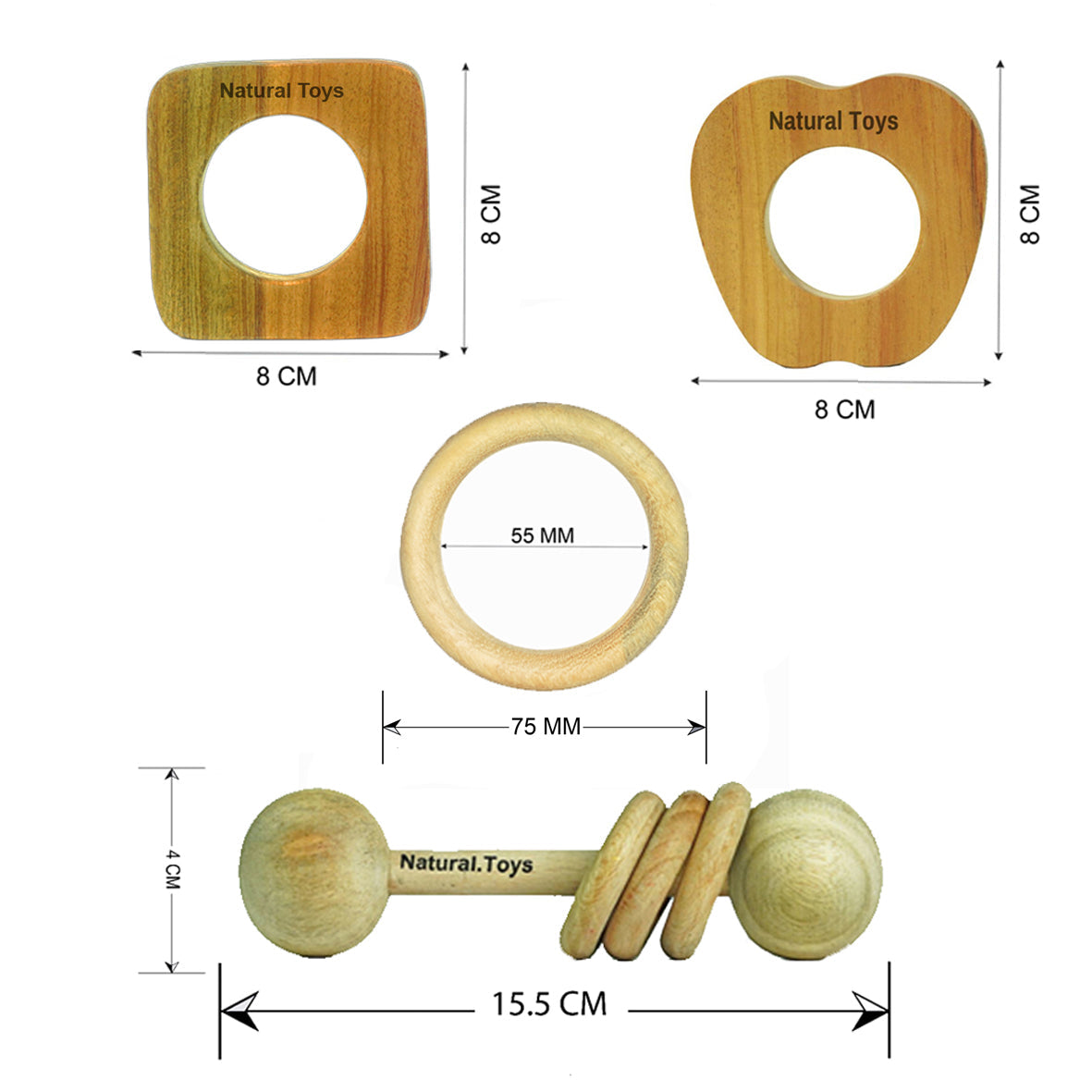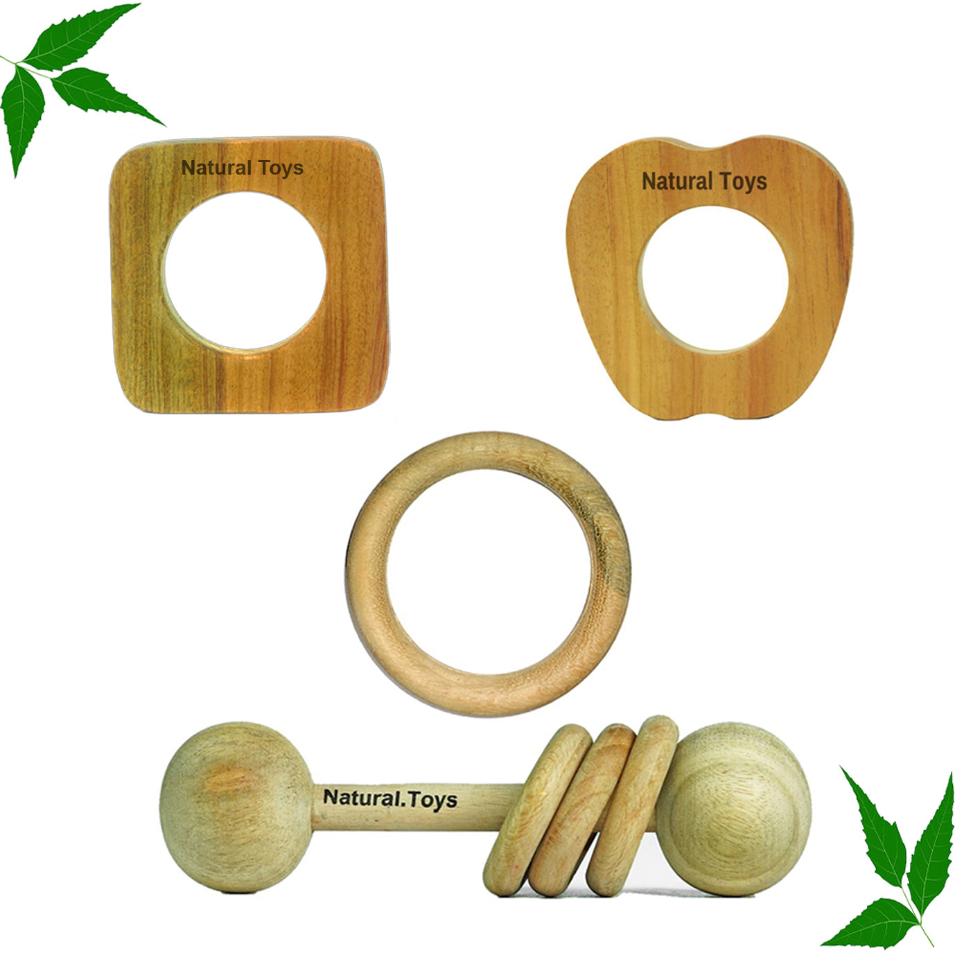 Buy Natural.Toys Neem Wood Teether Combo For Infant (Dumbbell Rattle + Apple Teether + Square Teething + 75Mm Ring) Baby Teethers Set