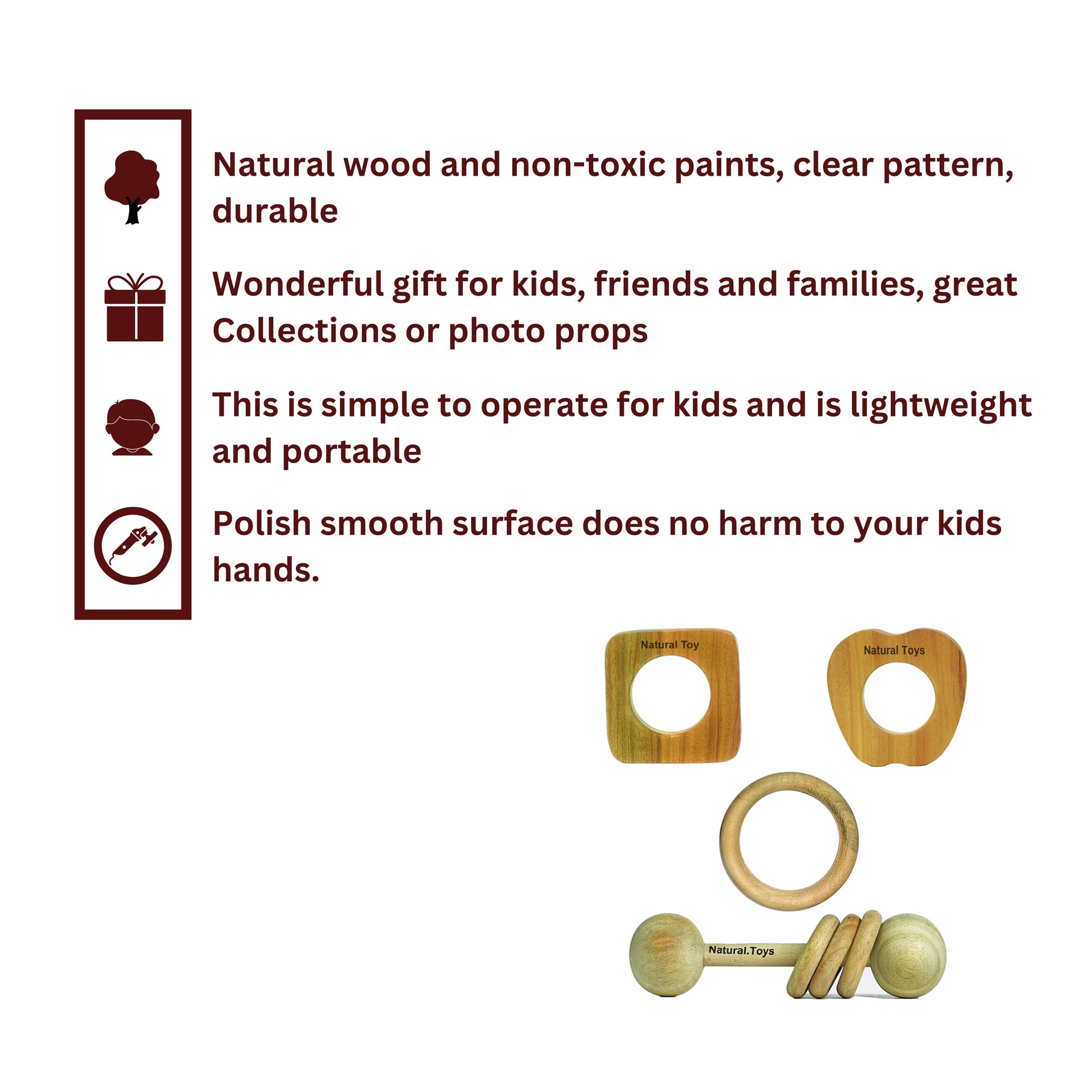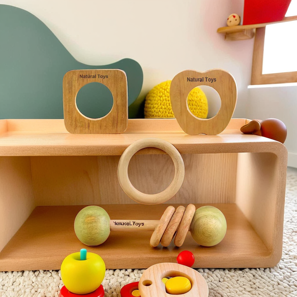 The natural antibacterial properties of neem wood make these teethers not only safe but also eco-friendly. Whether your baby is 3 months old and just beginning to teethe or approaching 6 months and dealing with molars, this wooden teether set is ideal. The different shapes and textures, from the engaging rattler to the easy-to-hold apple teether, offer sensory stimulation while alleviating teething pain.